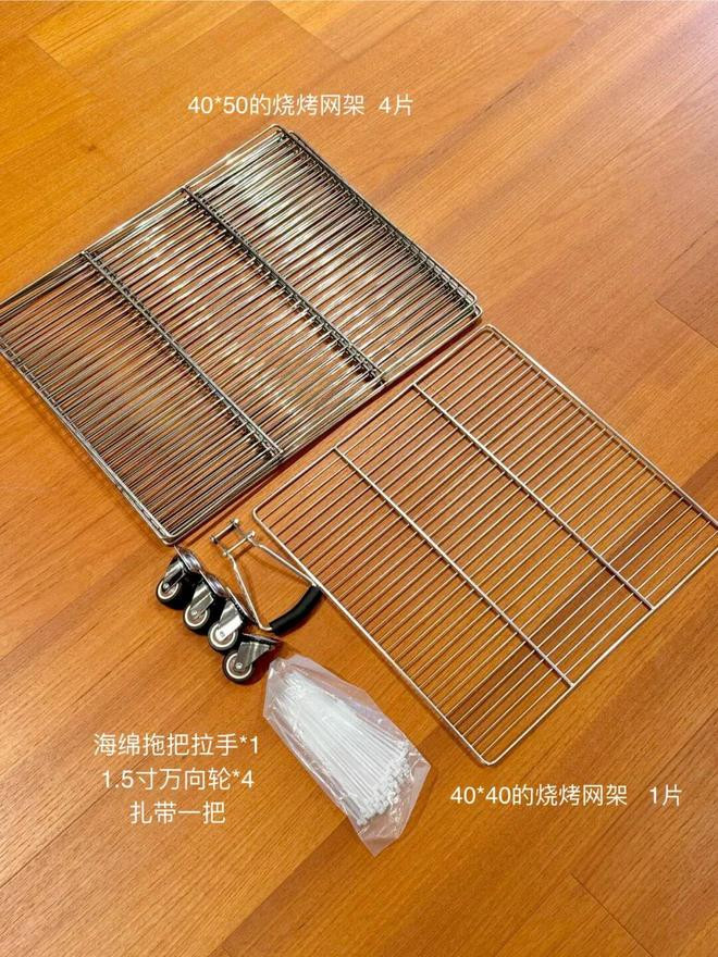 网购40*40烧烤网架1片、40*50烧烤网架4片、4个1.5寸万向轮、1个海绵拖把拉手,以及一把扎带。