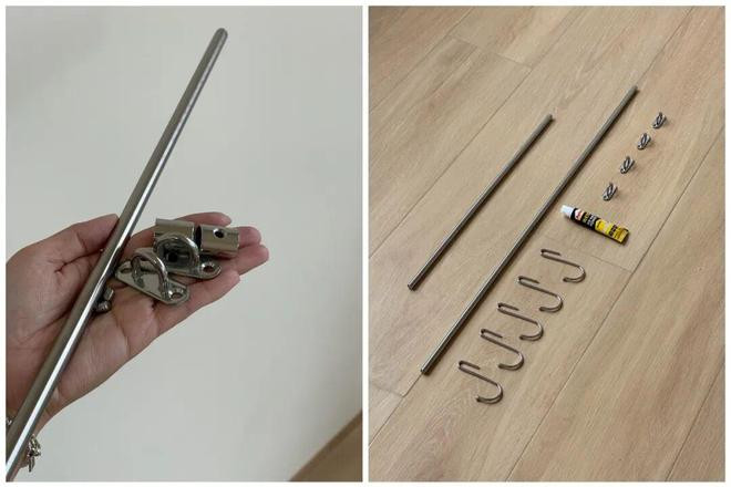 只需要网购一根不锈钢光轴、1对不锈钢吊环、1对不锈钢丝扣、若干个不锈钢挂钩,以及1管免钉胶。